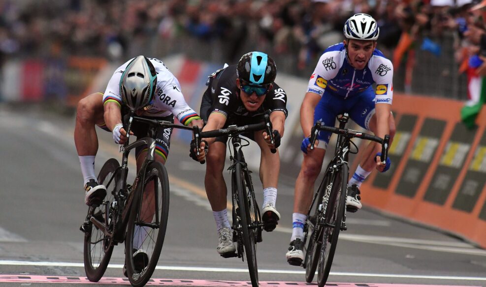 L’arrivée de la Primavera restera peut-être comme la plus marquante de l’année, avec un trio de gala et un sprint dingue. L’attaque de Peter Sagan dans le Poggio, seulement suivie par Michal Kwiatkowski et Julian Alaphilippe, a sans doute dessiné le trio le plus talentueux de l’année. Résultat sur la via Roma, les trois hommes, à la pointe de vitesse quasi similaire au terme de 300 kilomètres de course, terminent de front, séparés de quelques centimètres seulement, avec un Kwiatkowski vainqueur devant Sagan et Alaphilippe. Appréciez au passage la technique du lancer de vélo des trois larrons, déjà enseignée dans les écoles de cyclisme.