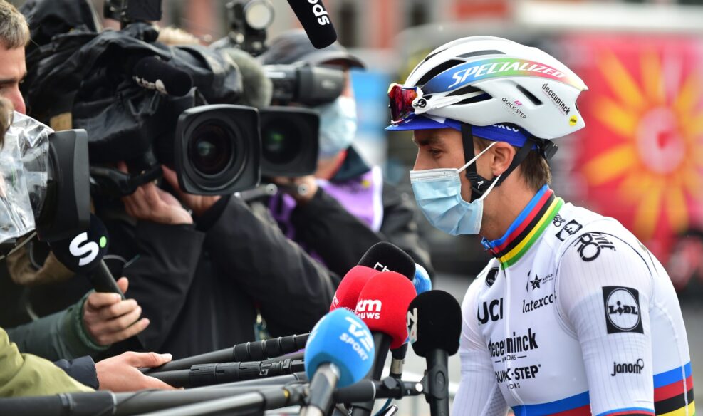 A 28 ans, Julian Alaphilippe est l’une des valeurs les plus sûres du cyclisme actuel. C’est déjà le cas depuis plusieurs saisons, mais le Français de Deceuninck-Quick Step a encore franchi un cap cette saison. Il y a bien sûr ce resplendissant titre de champion du monde remporté sur la piste d’Imola. Premier champion du monde français depuis 1997, le leader des Bleus a réussi un final parfait, bien aidé par ses coéquipiers tricolores – merci Guillaume, Quentin et tous les autres. A Imola, Alaphilippe a ainsi pris sa revanche au terme d’une saison où ses rivaux lui ont mené la vie dure. Il y a eu Wout Van Aert, bien sûr, qui l’avait battu sur la via Roma sur Milan-Sanremo, mais aussi Roglic, vainqueur devant lui à Orcières-Merlette sur le Tour de France, ou Marc Hirschi, qui a failli lui piquer sa seule victoire d’étape sur la Grande Boucle à Nice, en tout début d’épreuve.