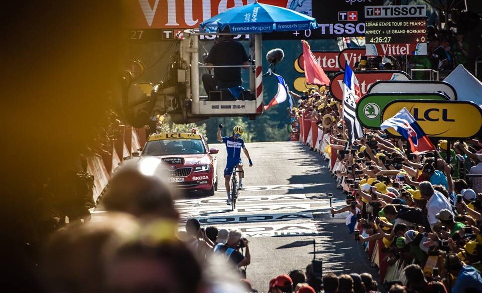 Alors Alaphilippe a pris le problème par les cornes. Après avoir été incapable de rivaliser avec Dan Martin à Mûr-de-Bretagne, il savait qu’il lui faudrait probablement prendre une échappée pour arriver à ses fins. « J’attendais beaucoup de moi la première semaine, en Bretagne, mais je n’étais pas comme je le voulais, je n’avais pas les jambes pour m’imposer, a confié le Français. J’avais à cœur de me rattraper. » L’étape du jour, vers le Grand-Bornand, avait été cochée par Alaphilippe et Quick-Step. Le garçon connaissait le coin pour y être déjà passé plusieurs fois, sur le Tour ou le Dauphiné. Et le plan s’est déroulé sans accro. « C’est incroyable. Je n’ai pas les mots. Je voulais aller devant aujourd’hui, mais je ne pouvais pas imaginer terminer en solitaire, comme ça », répétait-il en zone mixte puis en conférence de presse. Il a finalement compris que c’était bon dans la fin de l’ascension du col de Romme, puis surtout dans la descente, où il comptait presque deux minutes d’avance sur ses premiers adversaires.