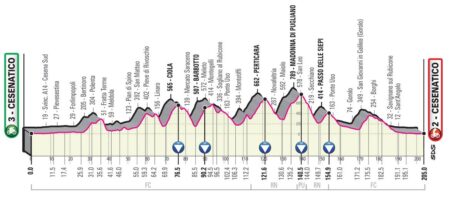Cap au sud pour cette deuxième étape dessinée en hommage au pirate Marco Pantani, qui passa son enfance dans cette station balnéaire de la côte adriatique. Cette journée vallonnée verra les coureurs gravir neuf ascensions, dont cinq sont répertoriées pour le classement de la montagne.
