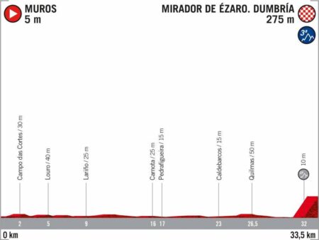 Un contre la montre en bord de mer, totalement plat jusqu’à l’ascension du Mirador de Ezaro : 1 800 mètres à plus de 14 % de moyenne. Le dernier effort pour les leaders au classement général et l’occasion pour les meilleurs rouleurs de rattraper l’éventuel retard accumulé en montagne.