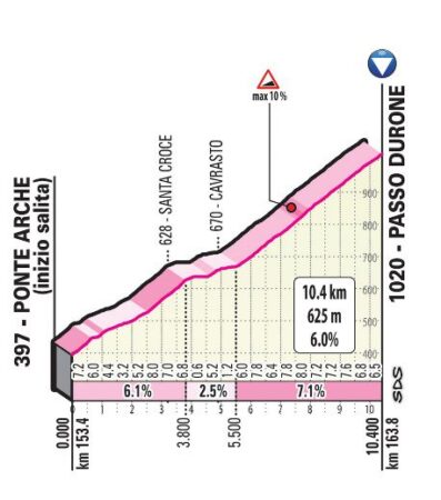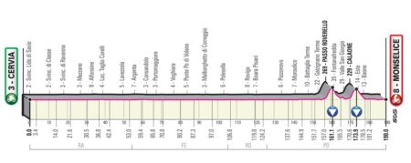 Après une journée passée en plaine, le peloton se frottera à son arrivée en Vénétie à deux bosses courtes mais pentues. Le Muro di Calaone, dont le sommet sera franchi à moins de vingt kilomètres de la ligne d’arrivée, présente des pourcentages de près de 18 % à certains endroits.