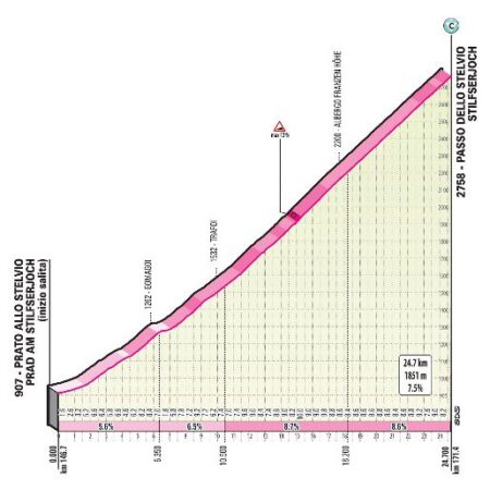 Nouvelle étape de montagne, sans doute plus dure encore que la veille : au programme 5 400 mètres de dénivelé et un passage à plus de 2 000 mètres au sommet du mythique Stelvio. L’arrivée est prévue aux lacs de Cancano dont les 3,5 derniers kilomètres sont rythmés par 17 lacets.