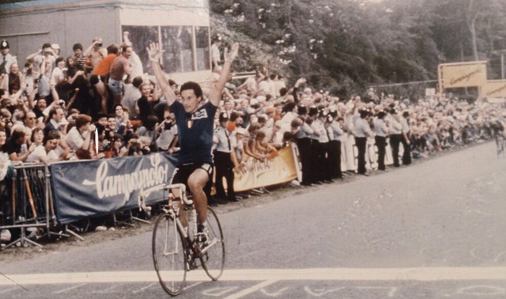 Il est de notoriété publique qu’entre Giuseppe Saronni et Fransesco Moser, ce ne fut pas l’amour fou. Question de suprématie entre deux des plus fameux coureurs italiens de l’époque. Les Mondiaux, Moser en est un connaisseur, puisque vainqueur en 1977 et deuxième un an plus tard. Pour cette édition 1982, il décide alors de faire abstraction de sa rivalité avec Saronni pour le bien de l’équipe d’Italie. Du côté de Goodwood, dans le Sussex, la Squadra Azzura sera intraitable. Il faut dire qu’avec Saronni, il y a de quoi rêver au titre. Le bonhomme possède un palmarès conséquent, avec notamment une victoire sur le Giro 1981. Rapide au sprint, il obtient de Moser qu’il se sacrifie dans l’ultime ascension, en chasse derrière l’Américain Jonathan Boyer. Mais le rouleur italien ne bouche pas le trou tout seul et doit attendre l’aide d’un allié inattendu. C’est en effet Greg Lemond qui fait le forcing et ramène tout le monde sur son équipier. Un tactique calamiteuse, qui laisse alors le champ libre à Saronni, qui anticipe le sprint avec un démarrage fulgurant. Un beau maillot irisé l’attend : il sera dignement honoré. Avec l’arc-en-ciel sur les épaules, le Piémontais gagnera Milan-Turin, le Tour de Lombardie, et l’année suivante, Milan-Sanremo et le Tour d’Italie.