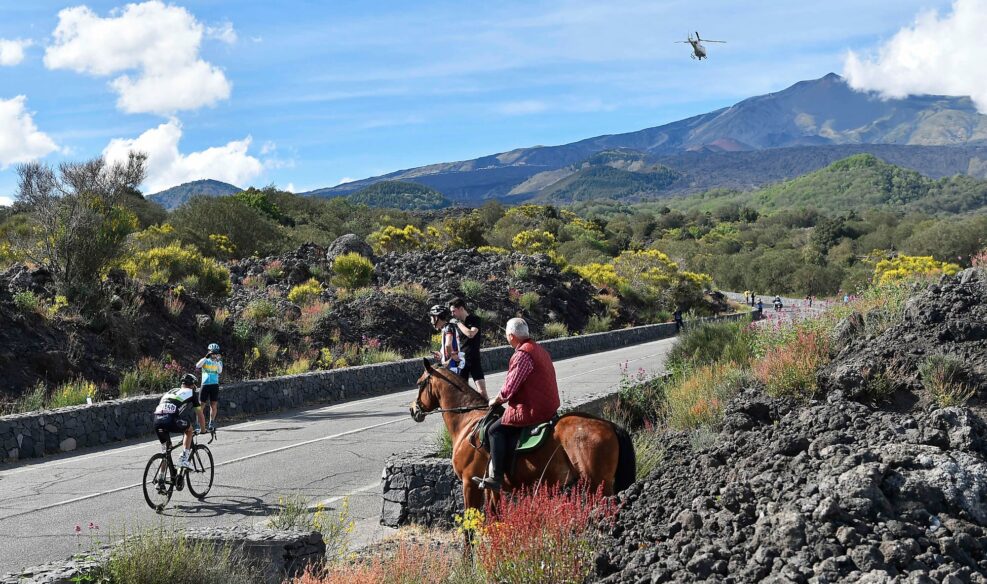 Sa pente d’abord : 22,7 km à 6,5 % de moyenne pour sa version la plus longue (15 km à 6,7 % pour sa version 2018). Si le Giro connait pléthore de profils largement plus abruptes (le Zoncolan notamment), le volcan fait partie de cette caste rare des cols interminables (plus de 20 km) au même titre qu’un Stelvio ou… un Ventoux. Le mythe de la longueur et de la touffeur. Car l’Etna est en activité permanente et l’odeur omniprésente du souffre qui s’échappe de la montagne des montagnes siciliennes en confirme la difficulté. Sa fougue explosive renforce d’ailleurs un peu plus son mythe et la constante incertitude pour l’organisation. La dernière éruption au printemps 2016 avait créée un panache de fumée de sept kilomètres de hauteur empêchant toute activité physique trop proche de son cœur. Par chance, le Tour d’Italie avait évité le colosse cette année-là.
