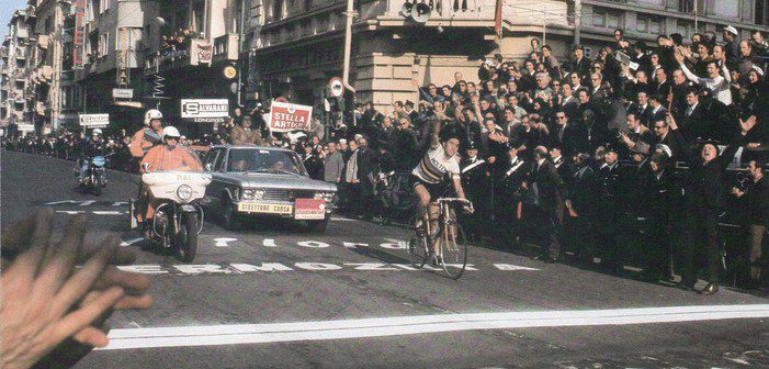 Presqu’aussi bon grimpeur et puncheur que sprinteur, le Belge était taillé pour Milan-Sanremo, et il n’a jamais fait dans le détail sur la côte ligurienne. Pourtant, ils ne sont pas rares les coureurs sur le papier faits pour une épreuve et qui ne la remportent jamais. Le natif de Meensel-Kiezegem n’a pour sa part jamais douté sur la Classicissima, pas toujours au top, et pourtant si souvent vainqueur. En 1966, alors qu’il n’a que 20 ans et qu’il vient d’arriver chez Peugeot, Merckx est aligné sur l’épreuve transalpine. Pas vraiment en inconnu, car il a déjà 84 succès amateurs dans la besace, et notamment un titre de champion du monde. Mais tout de même. Qui pouvait se douter que ce gamin allait faire la nique aux plus grands sur la via Roma ? La célèbre avenue de Sanremo, magnifiée chaque année par la course, mais finalement très banale le reste du temps, sacre un jeunot qui va devenir le plus grand cycliste de tous les temps. A l’époque, on le connaît encore mal, et puisqu’il s’impose au terme d’un sprint en comité réduit, on le qualifie de nouvelle star du sprint. On se rendra compte les années suivantes qu’Eddy Merckx est bien plus que ça.