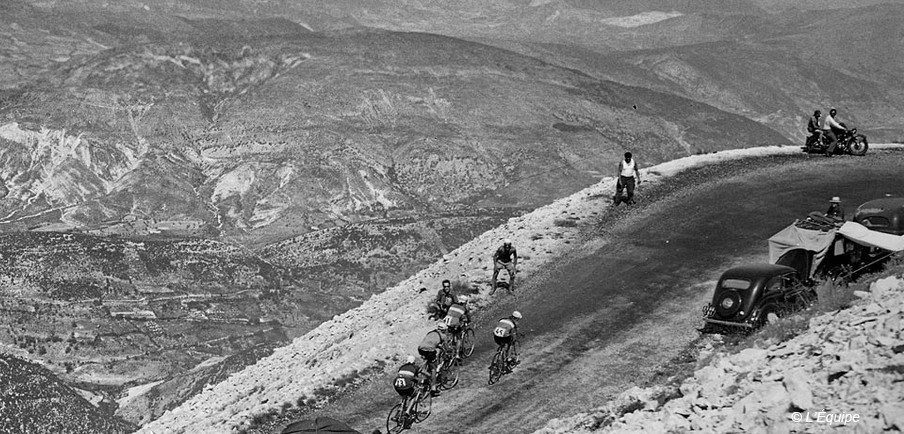 Dans les ascensions légendaires du Tour, le Mont Ventoux figure donc en toute logique aux côtés des Tourmalet et autres Galibier. Mais alors que ces deux autres monstres du cyclisme français ont déjà plus de cent ans d’histoire et plusieurs dizaines de passages au sommet, le Ventoux a dû attendre entre la découverte d’Adrien Benoît et son inauguration sur les routes de la plus grande épreuve du monde. Mais en seulement 14 montées, il a su se forger une histoire. Dans le bonheur, souvent. Avec les deux victoires de Louison Bobet un jour où le monstre était au programme, puis celle de Raymond Poulidor en 1965 lors de la première arrivée au sommet. Mais aussi dans le malheur et la polémique, presqu’inévitablement. Dès 1955, lorsque Jean Malléjac est victime d’un malaise dans la montée, avant que le Suisse Ferdi Kübler, en plein délire après un effort démesuré dans un col qu’il ne connaissait absolument pas, pensant monter, descendit le Mont provençal jusqu’au pied. Avant de prononcer quelques jours plus tard, au moment d’abandonner, des mots désormais mythiques : « Ferdi a mal… Ferdi s’est tué dans le Ventoux ! »